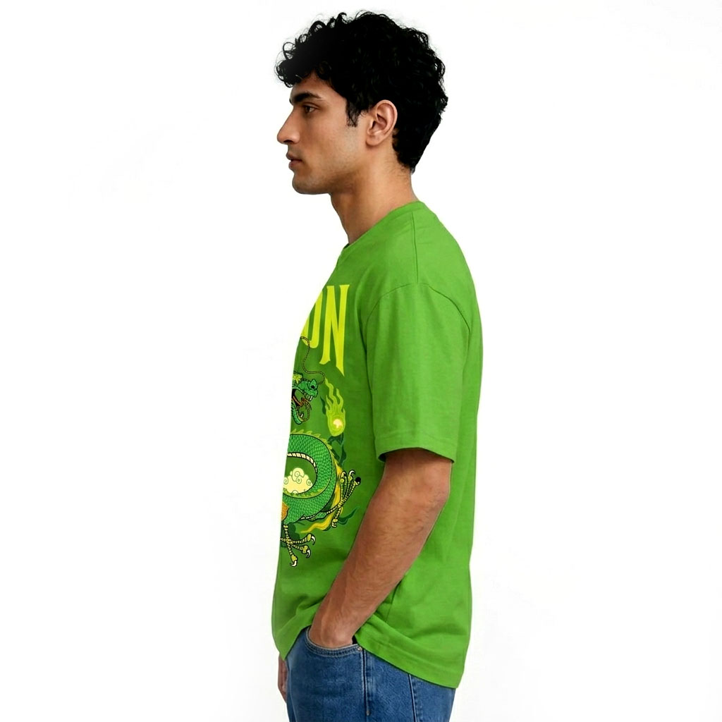 Made from high-quality breathable cotton, this T-shirt ensures all-day comfort while keeping your look fresh and stylish. The vibrant green base combined with a striking yellow “DRAGON” typography creates a standout streetwear piece perfect for modern fashion lovers.