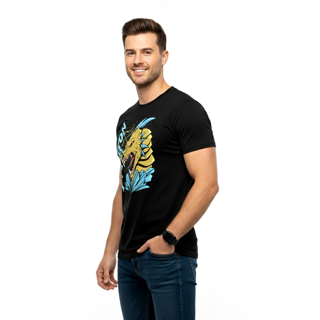 This Men’s Black Dragon Graphic T-Shirt, made for people who enjoy strong imagery and daring fashion, will let you show off your bold side. This t-shirt immediately stands out thanks to its eye-catching yellow and blue dragon illustration with dynamic detailing.