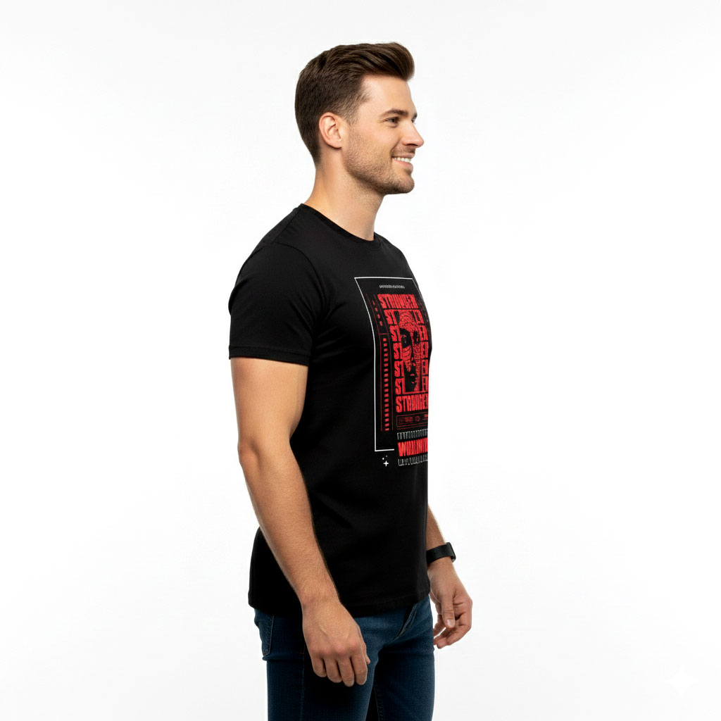 This t-shirt has a clean, contemporary fit and is made of high-quality, breathable cotton fabric for all-day comfort. The stunning visual appeal of the high-contrast red print on a black foundation makes it perfect for everyday motivation, streetwear, casual outings, and gym attire.