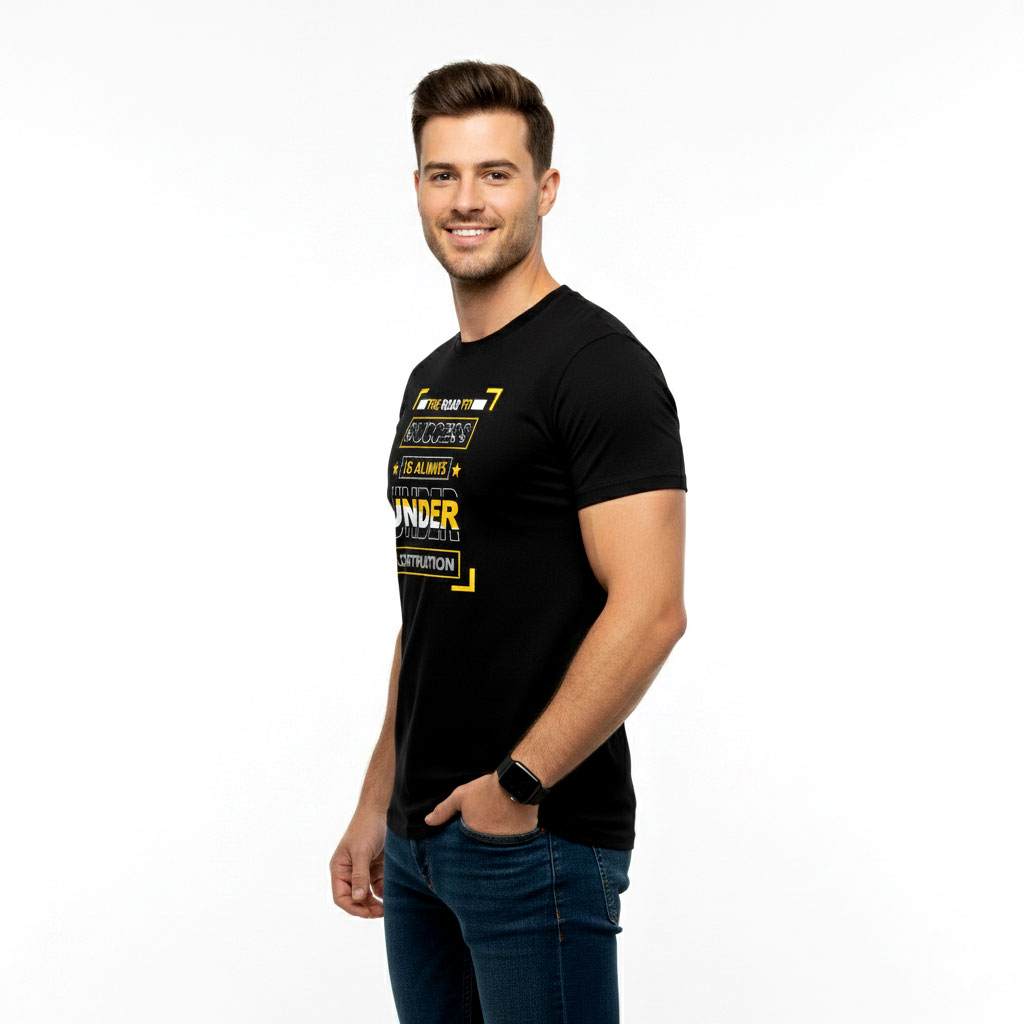 Men’s Motivational Black T-Shirt – “The Road to Success Is Always Under Construction” Graphic Tee