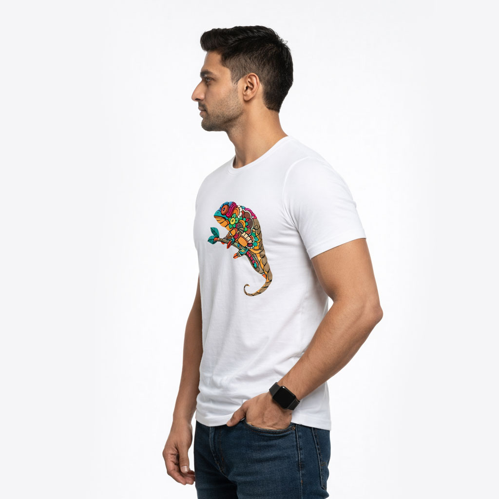 Add a pop of creativity to your everyday style with this Men’s White Chameleon Graphic Printed T-Shirt. Designed for modern men who appreciate art-inspired fashion, this T-shirt features a vibrant chameleon illustration that symbolizes adaptability, uniqueness, and confidence.