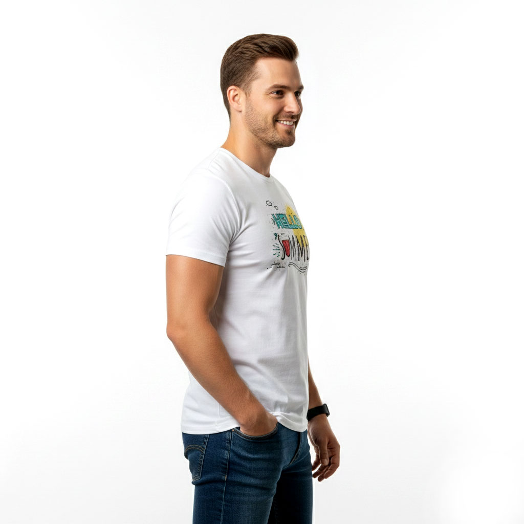 This Men’s White “Hello Summer” Graphic T-Shirt will help you greet the sun in style. This t-shirt embodies the lighthearted and carefree spirit of the season with its bright, vivid summer-themed print, playful lettering, and eye-catching details.