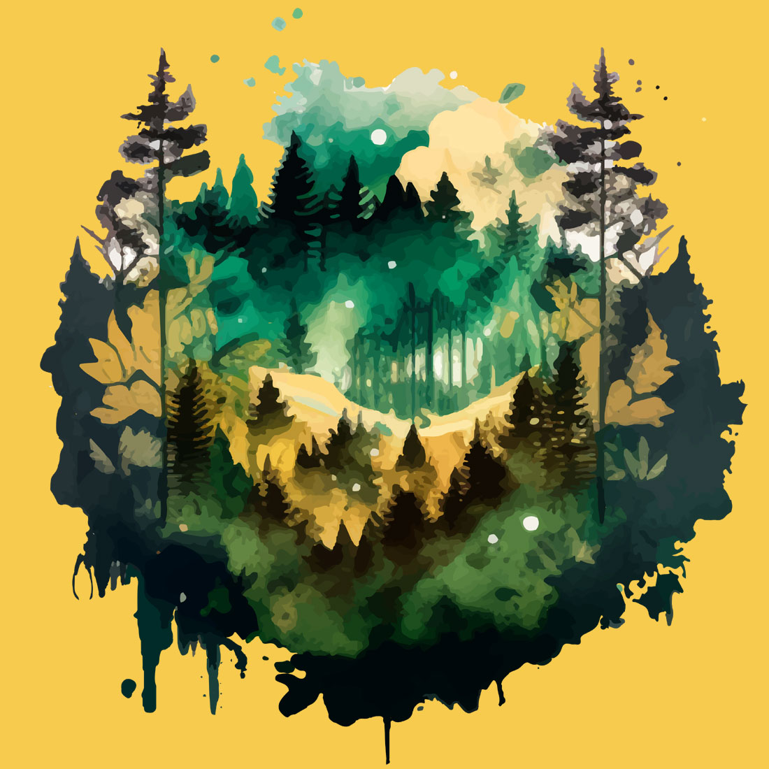Bring the beauty of nature into your everyday style with this stunning forest graphic T-shirt. Set against a vibrant yellow backdrop, the design features a unique watercolor-style landscape with lush trees and a serene wilderness vibe, complete with artistic paint-drip detailing for a modern, creative touch.